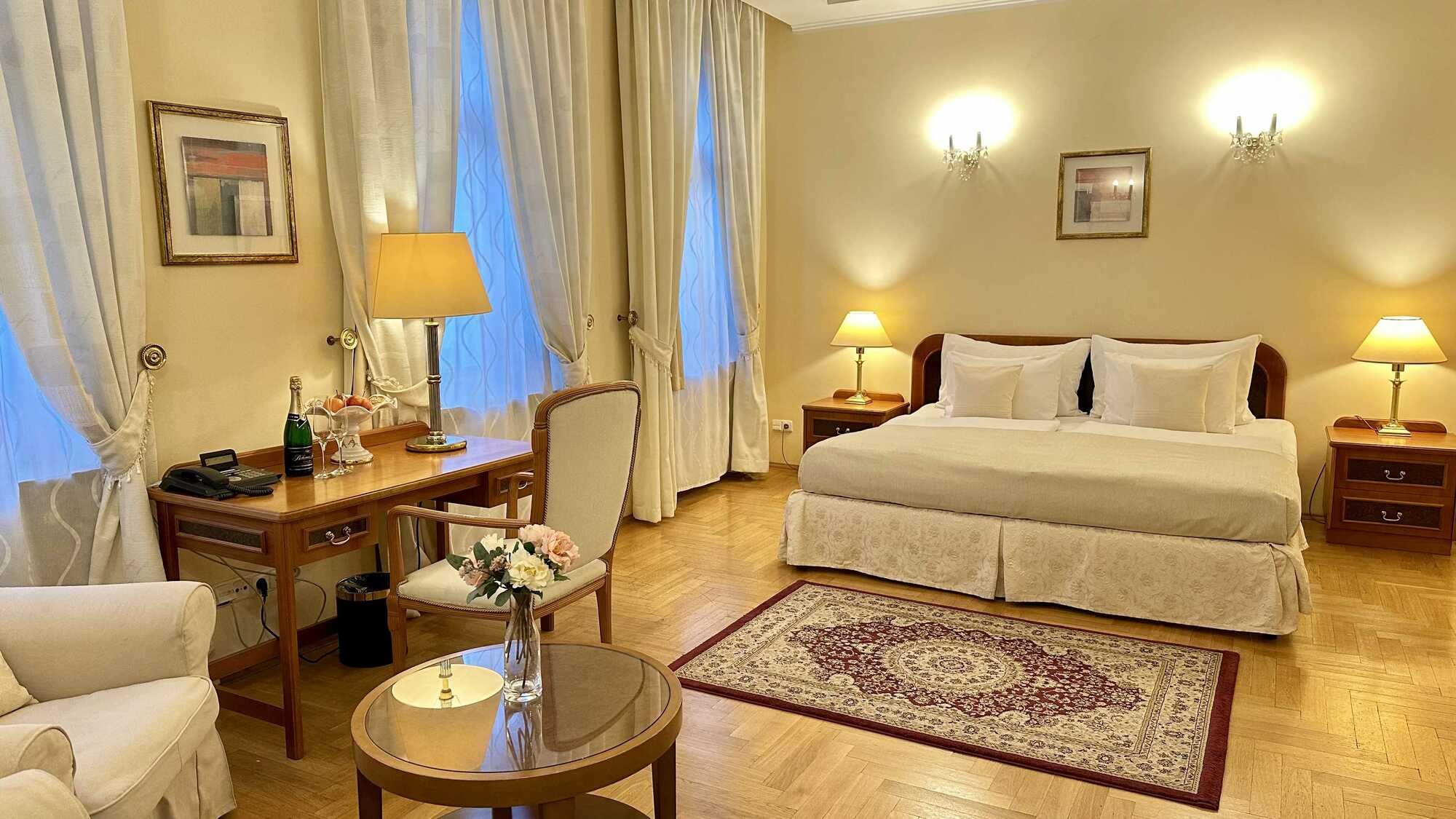 The room includes a comfortable double bed, a stylish sofa, and a cozy armchair creating a perfect space for relaxation. Guests can enjoy a small coffee machine for a pleasant start to the day or a quiet moment in the evening.Large windows provide natural light, while soft lighting and tasteful décor add to the suite’s charming and welcoming character.