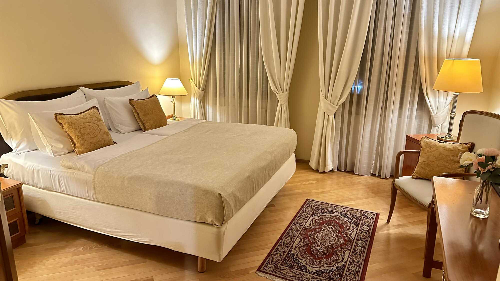 The room features a large double bed with quality linens, soft lighting, and classic furnishings that create a calm and welcoming atmosphere.Large windows with sheer curtains provide natural daylight while ensuring privacy.The room includes a work desk, seating area, bedside tables, and a private bathroom equipped with essential amenities.I